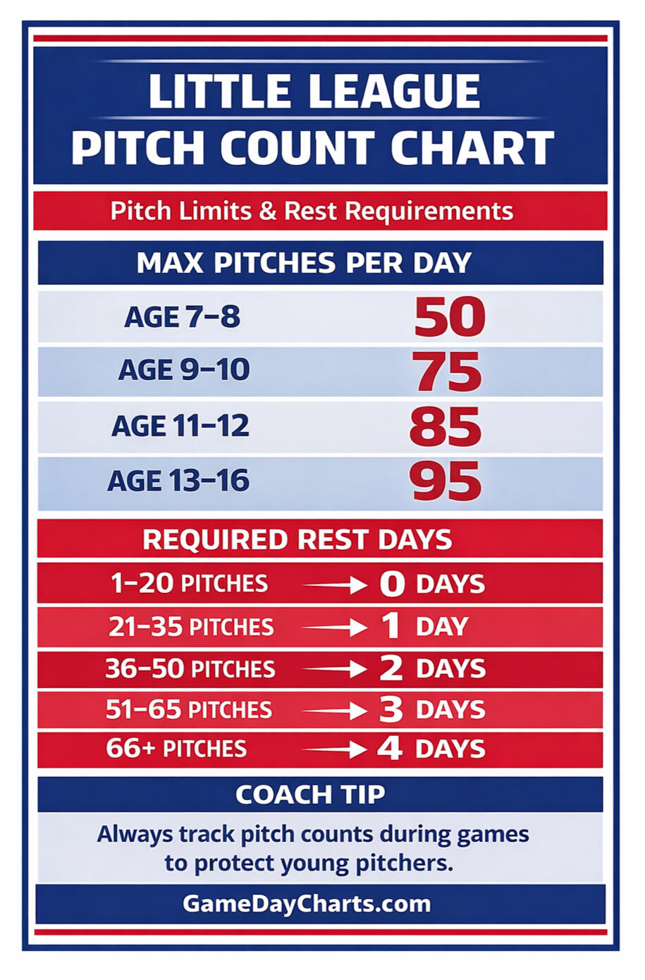 Little League pitch count rules are designed to protect young pitching arms from injuries. The chart above shows the maximum number of pitches allowed in a game and the required number of rest days before a pitcher can throw again.Coaches and parents can use this quick reference chart during games to ensure pitchers stay within the official limits and get the proper recovery time between appearances.These limits follow the official Little League Baseball pitching guidelines used in youth leagues across the United States.